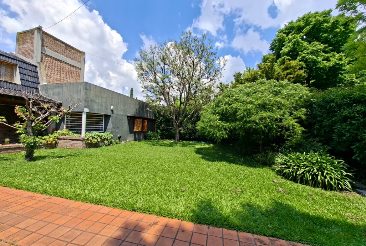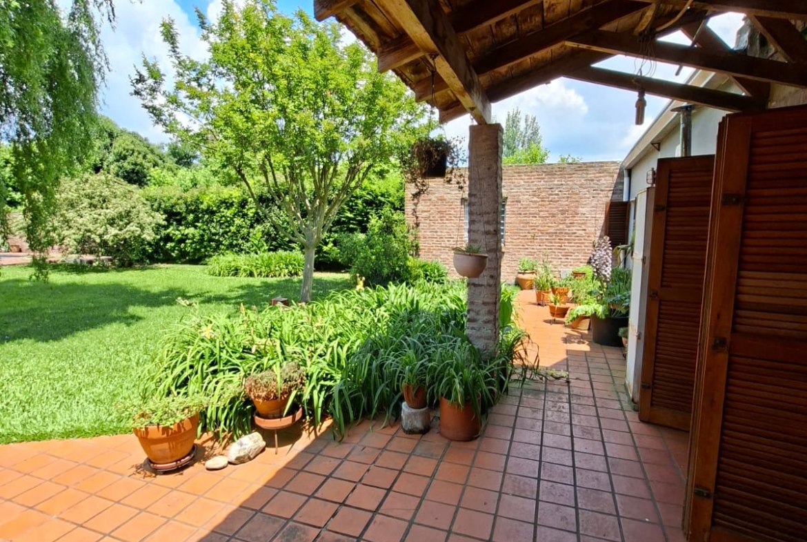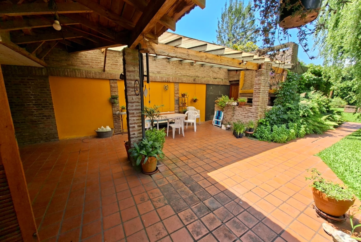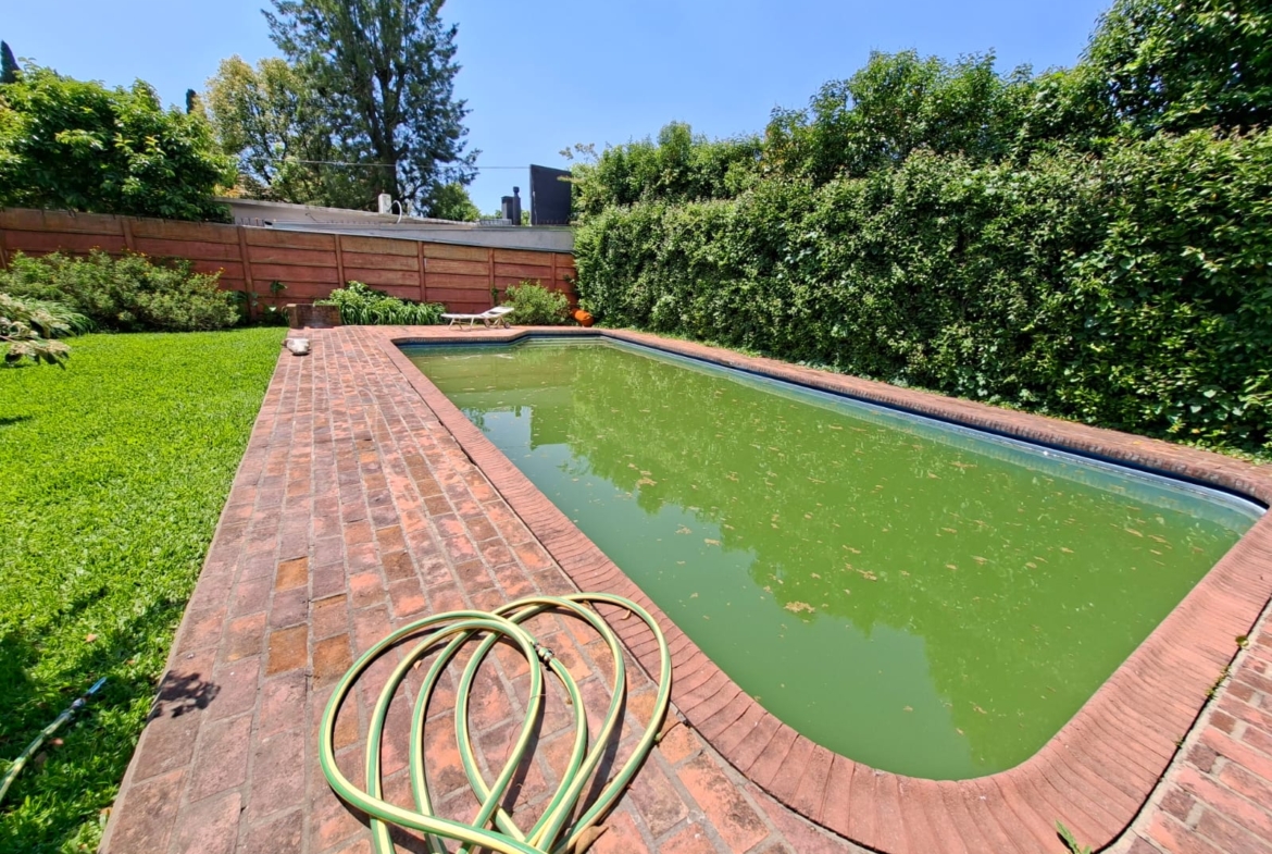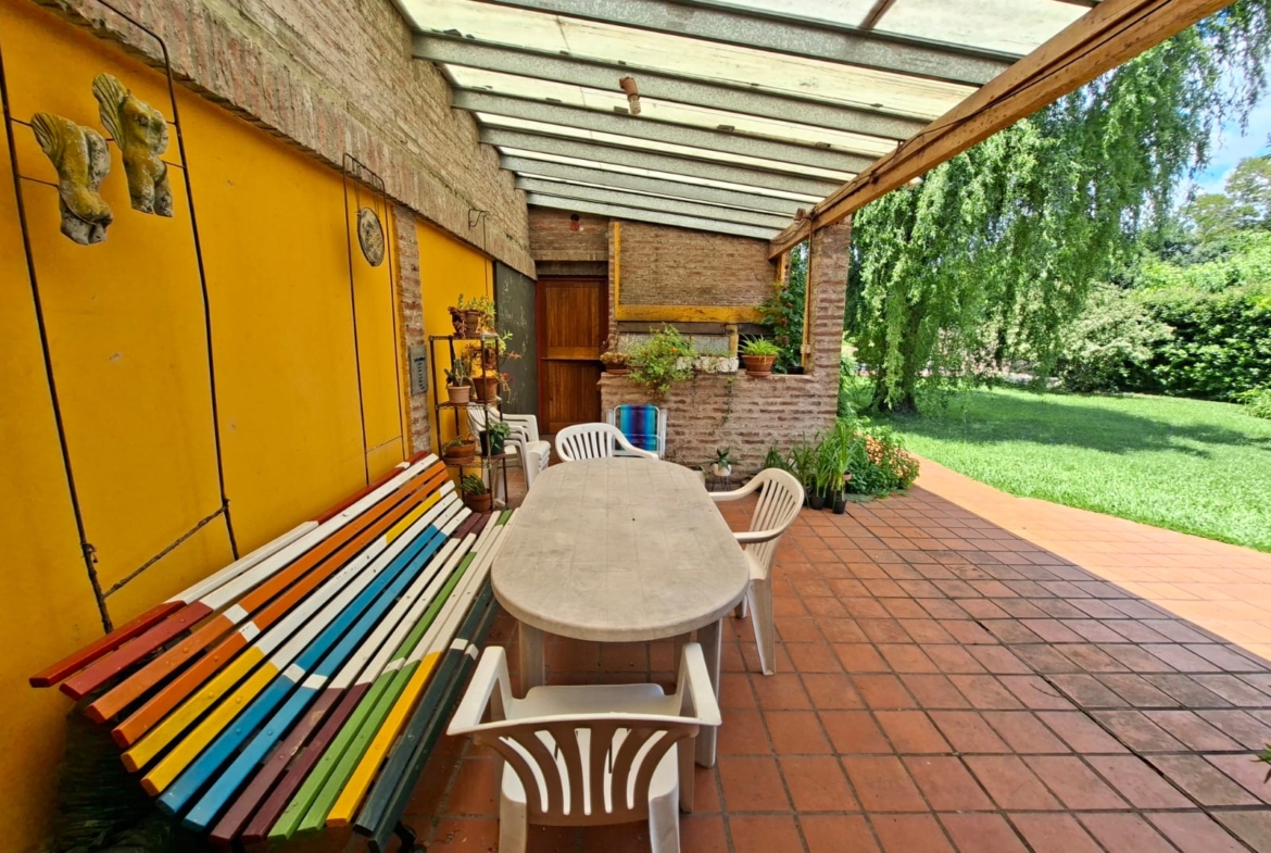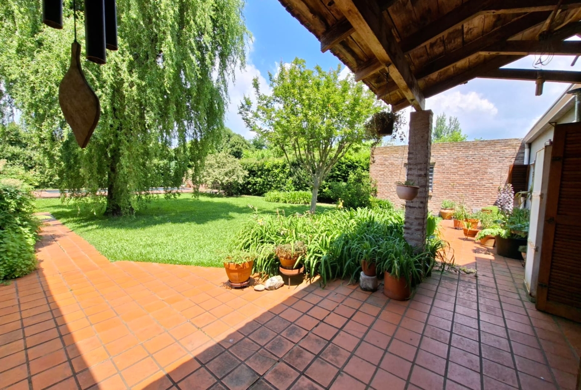 Fondo verde ideal para disfrutar el verano: jardín parquizado, pileta, quincho con parrilla y galería.